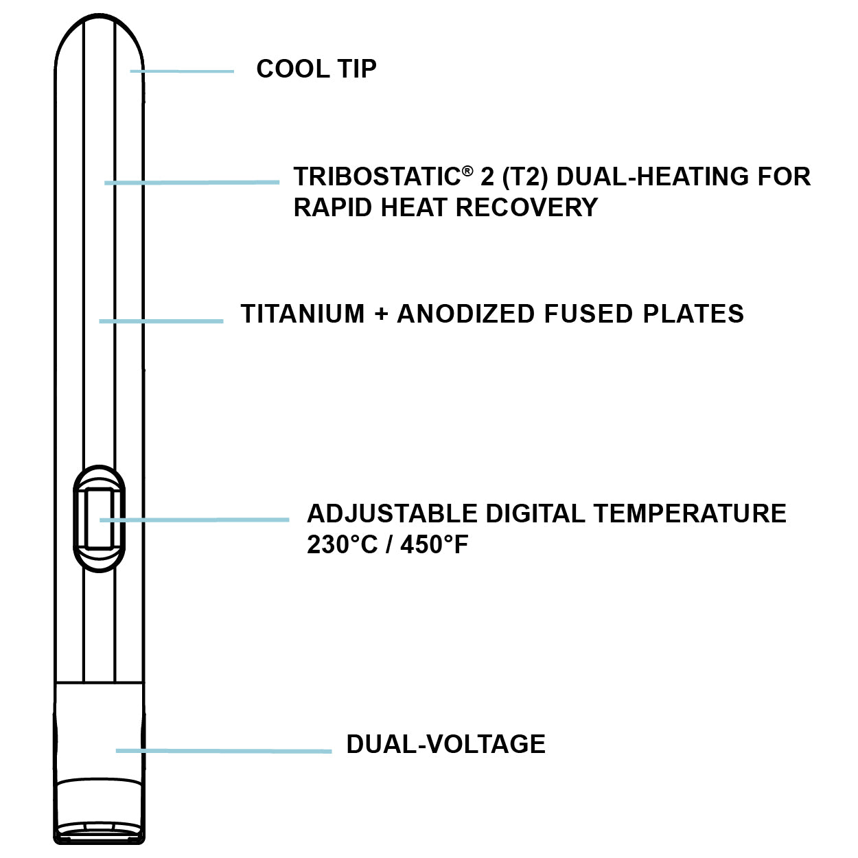 Made with Titanium + Anodized Fused Plates, Cool Tip Technology, and Tribostatic 2 - (T2) Dual Heating for Rapid Hair Recovery.